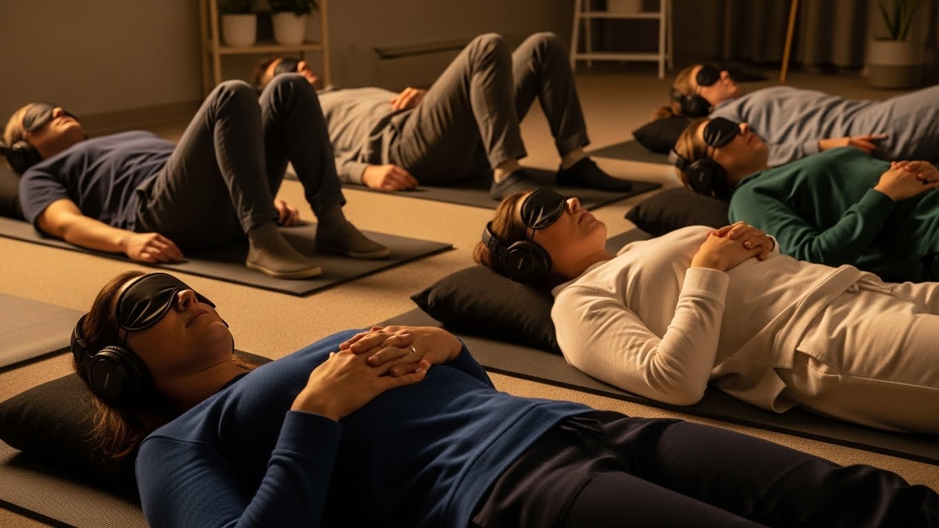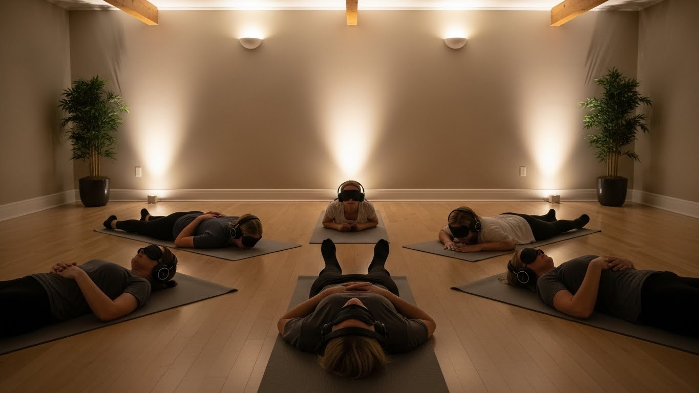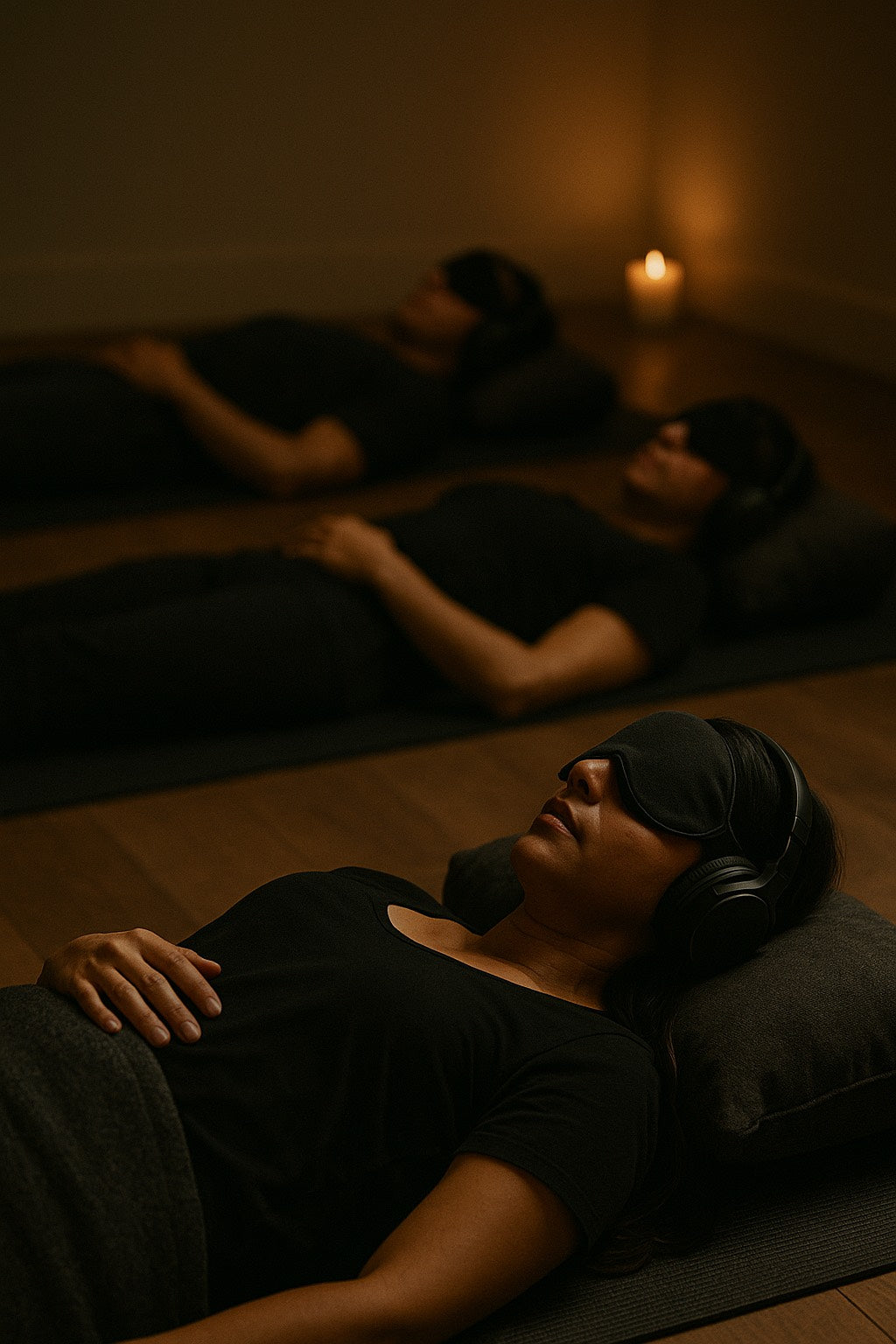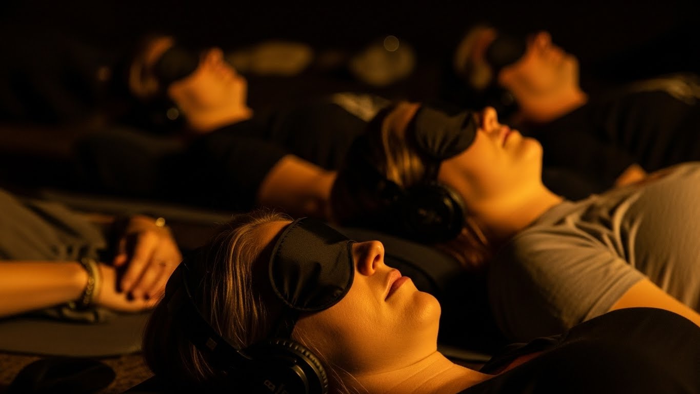 Participants are usually seated or lying down comfortably. The session includes gentle guidance, breath-based practices, and immersive sound delivered through headphones. There is time at the beginning to settle and orient, followed by the main experience, and a short period of rest or integration at the end.